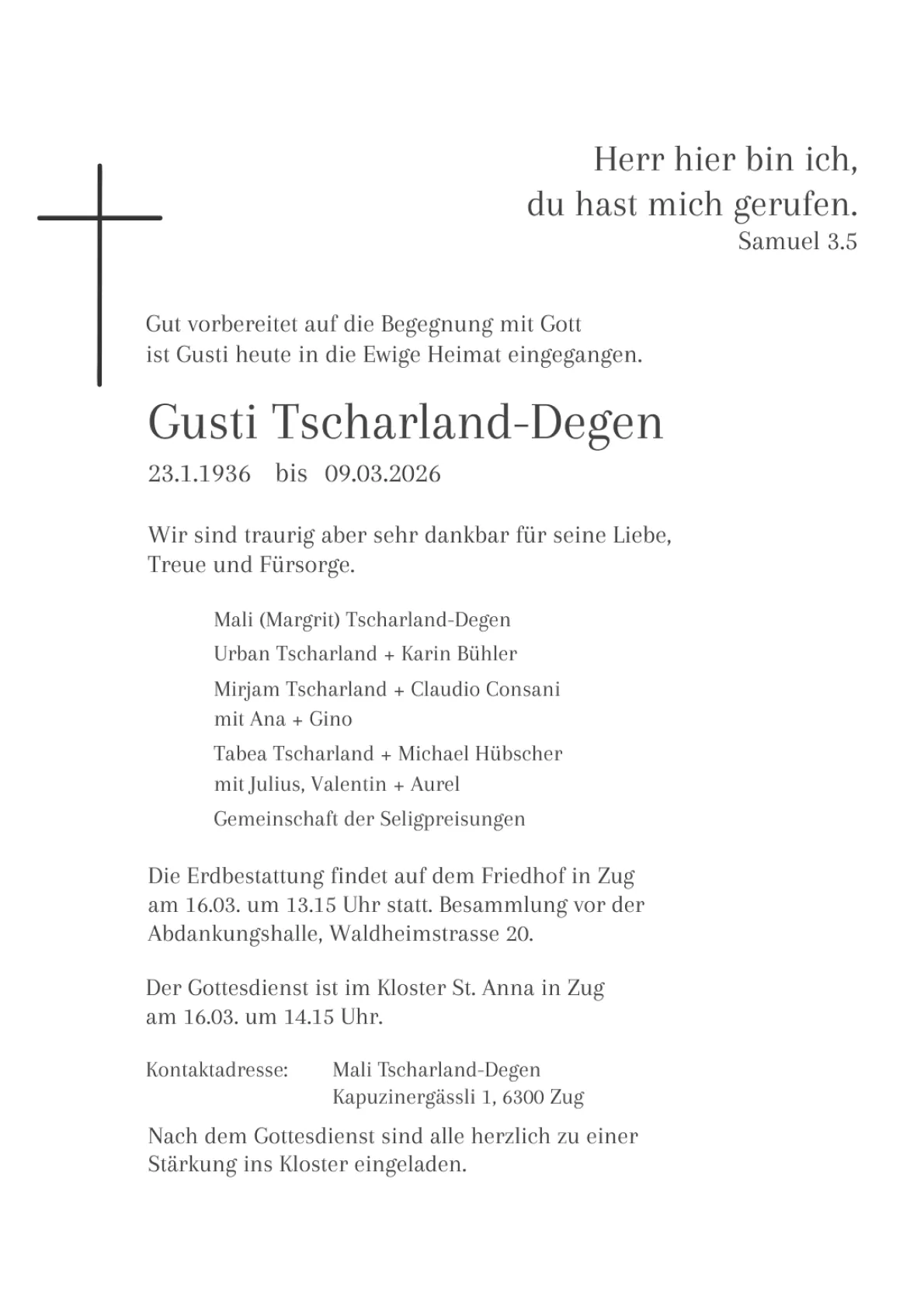 Erfüllt mit grosser Dankbarkeit durften wir in den letzten Tagen Abschied nehmen von unserem lieben Gusti. Seine Frau Mali hat ihn mit Hilfe der Spitex liebevoll gepflegt. Wir werden seinen verschmitzten Humor und seine Treue im Gebet in freudiger Erinnerung behalten.