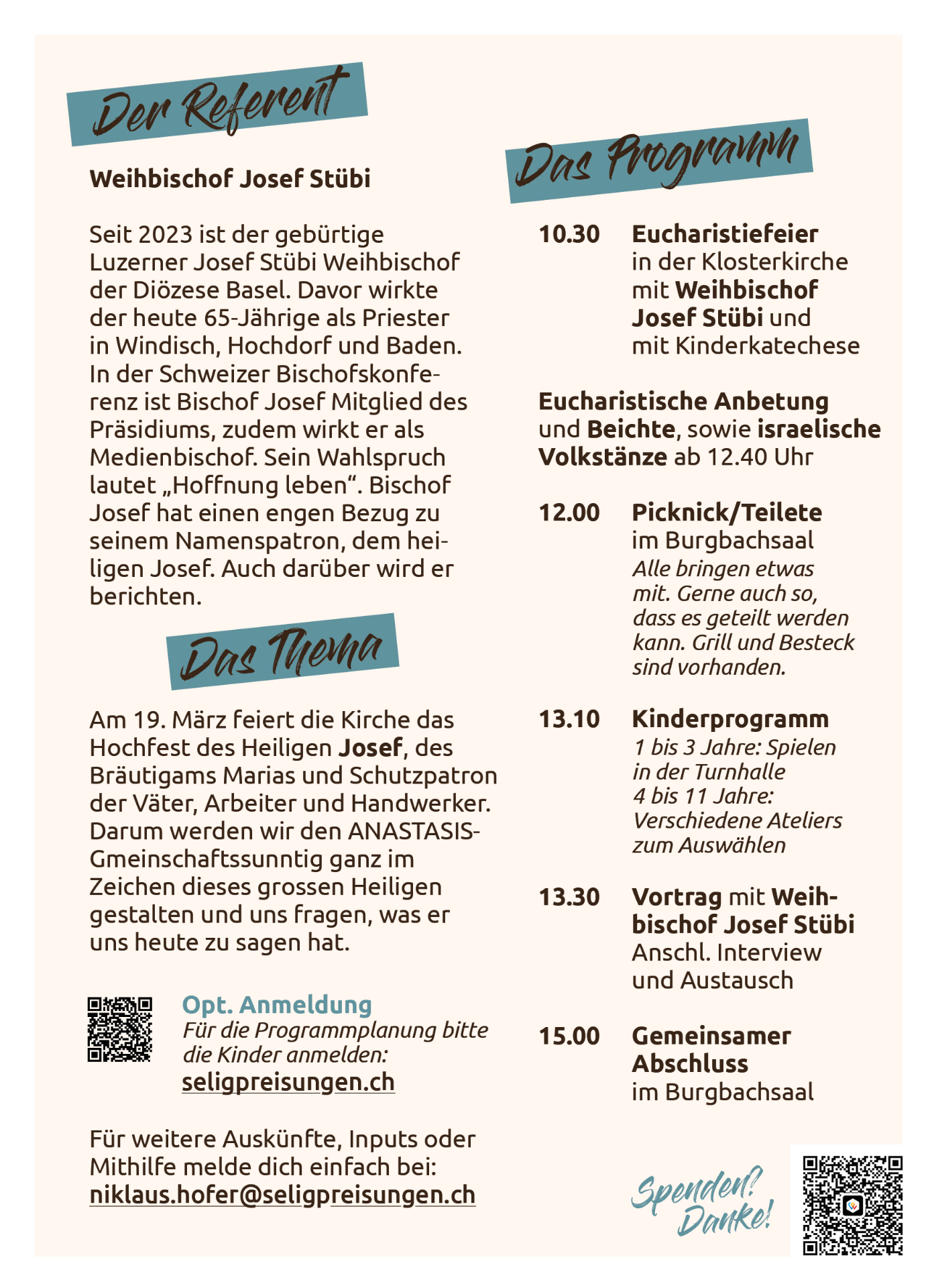 - 13.30 Uhr Impuls zum Heiligen Josef mit Weihbischof Josef Stübi und anschliessend Interview.