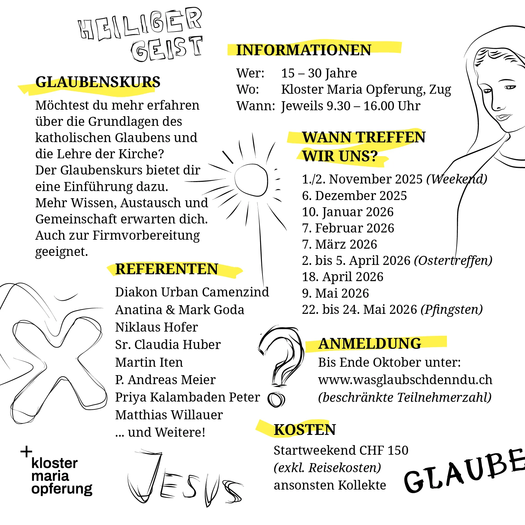 Möchtest du mehr erfahren über die Grundlagen des katholischen Glaubens und die Lehre der Kirche? Der Glaubenskurs bietet dir eine Einführung dazu. Mehr Wissen, Austausch und Gemeinschaft erwarten dich. Auch zur Firmvorbereitung geeignet.