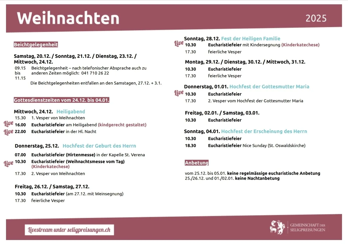 Spezielle Gebetszeiten: 24.12.25-04.01.26