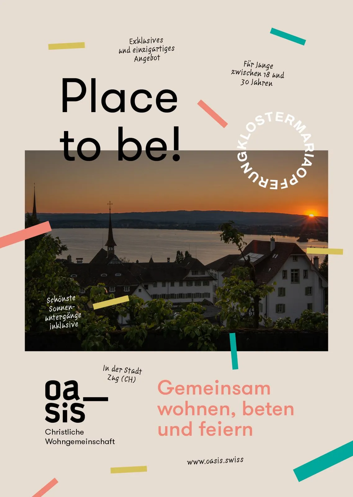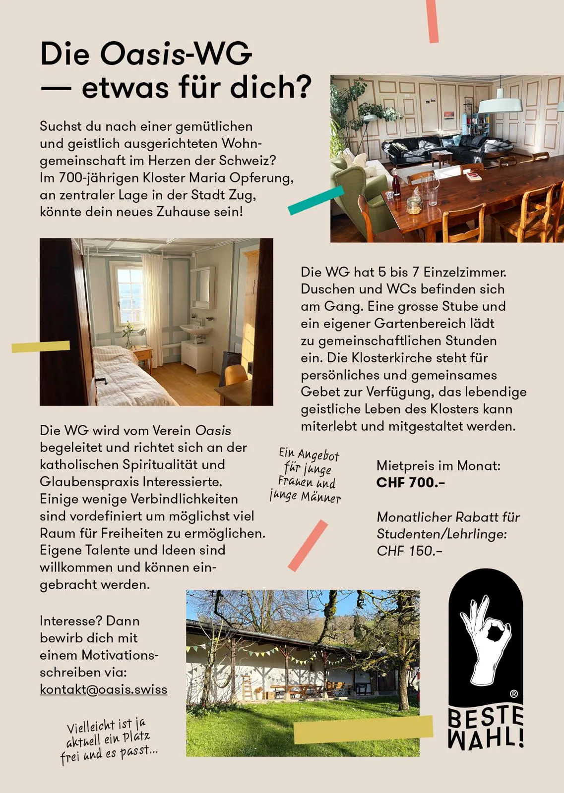 Beim Projekt Oasis leben ab August 2025 junge Erwachsene im Kloster Maria Opferung in Zug zusammen in einer Wohngemeinschaft und gestalten den Ort durch ihre Talente mit, sodass auch künftig neuer Wind durch die alten Mauern weht. Die Teilnehmenden bilden sich weiter und übernehmen Aspekte des klösterlichen Alltags. Sie tätigen Sozialeinsätze, sind in die Gartenbewirtschaftung involviert und machen das geistliche Leben mit Angeboten für die Öffentlichkeit zugänglich.